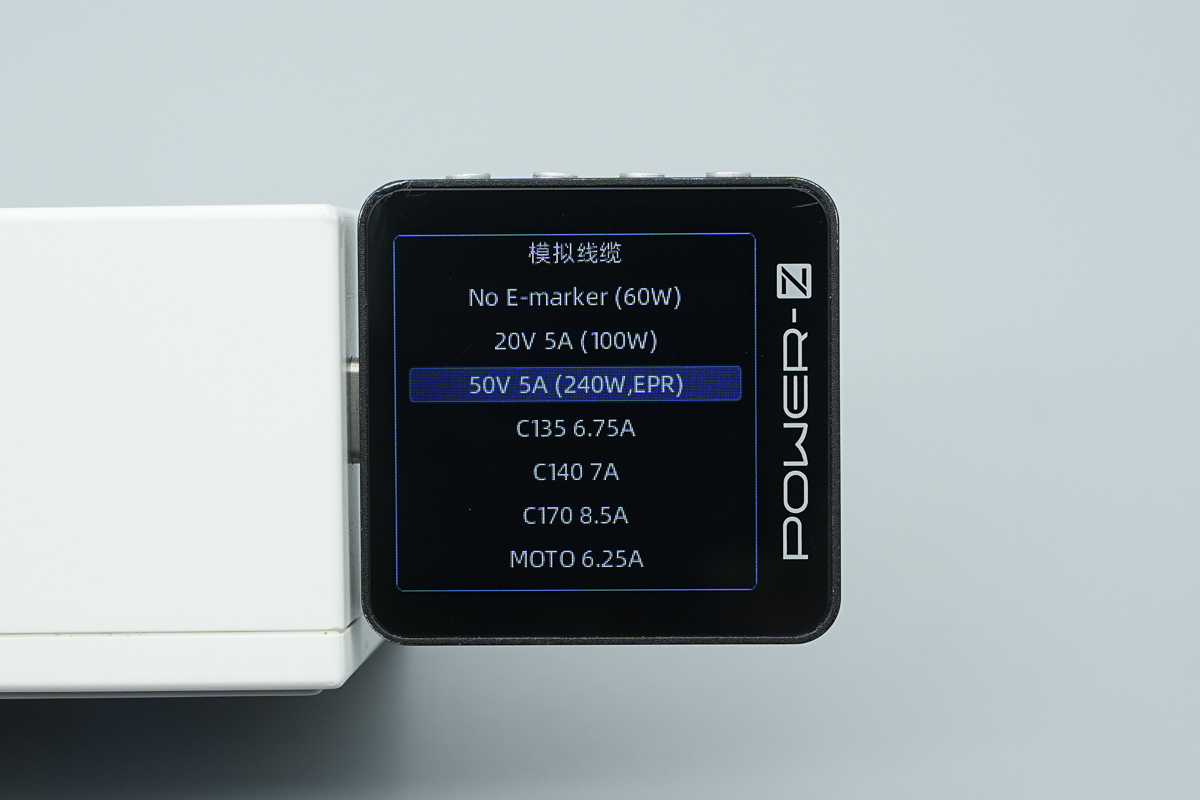 2、模拟线缆功能可根据需求选择No e-marker(60W)、20V5A(100W)、50V5A(240,EPR)模式,使用仪表公头测试时请求PD协议的最大功率档位,推荐默认设置50V5A EPR模式即可。