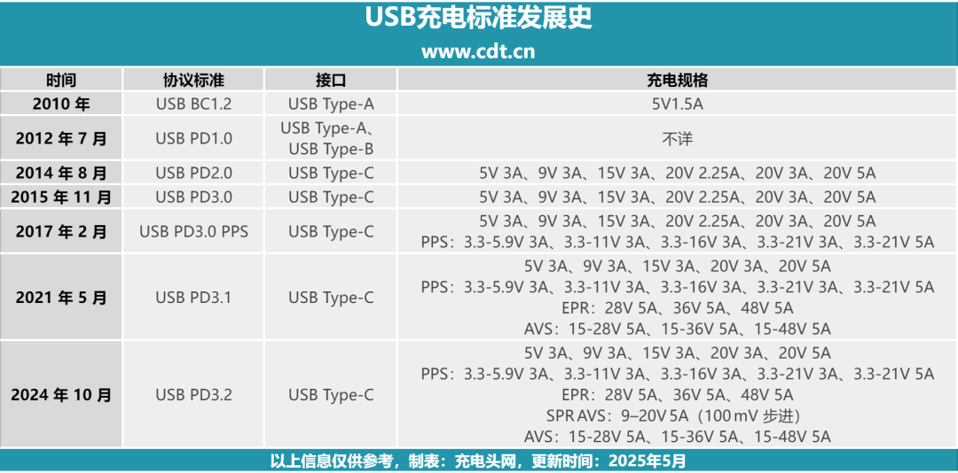 充电头网也整理了一份USB充电标准的发展历程,方便大家了解各个阶段的变化。