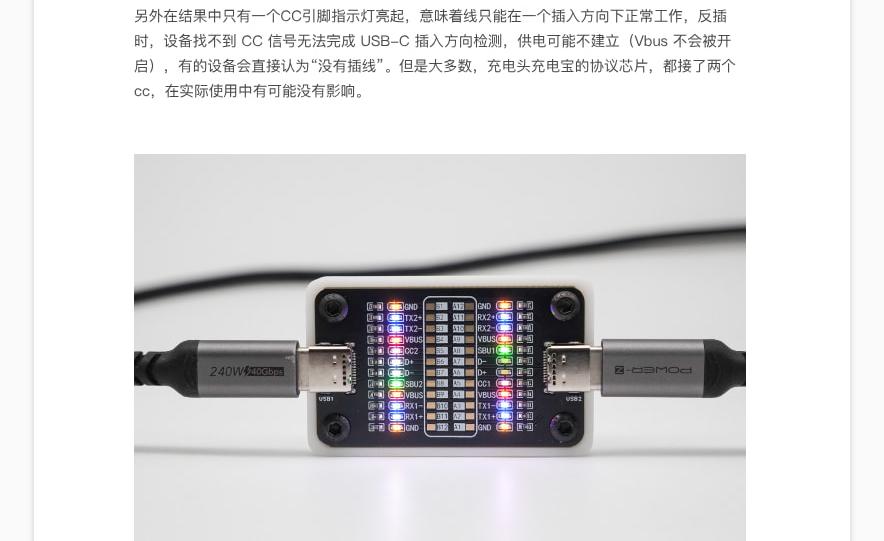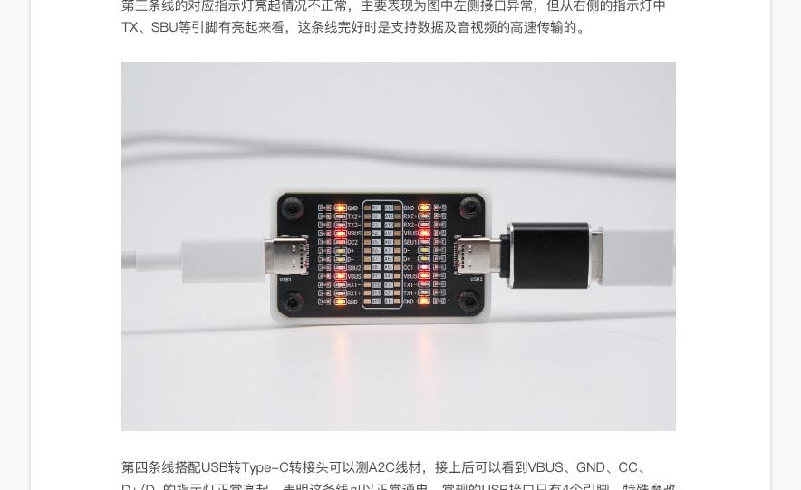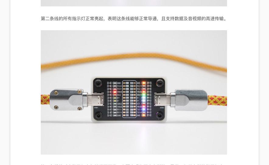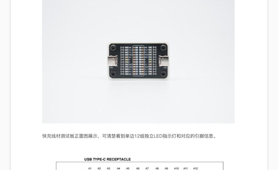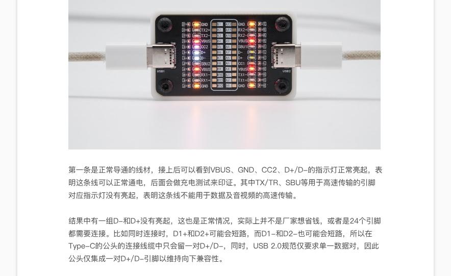 24pin 指示灯,对应Type-C接口的所有针脚,可以测试线材通断;